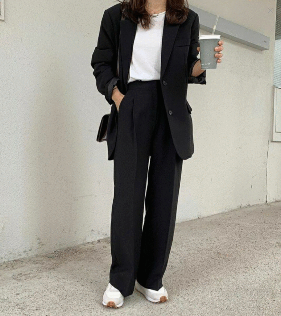 - Black trousers: This was my workwear base. I paired it with a white T-shirt and a blazer for a formal look . The next day, I paired it with a black tank top and a denim jacket for a casual look .